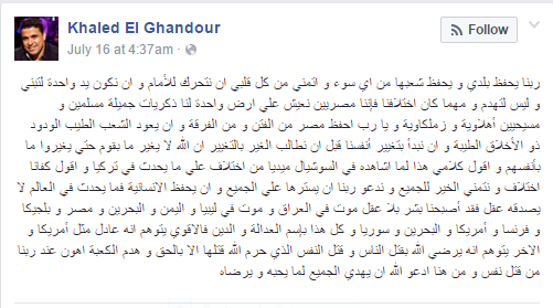 و أعرب لاعب نادي الزمالك السابق خالد الغندور عن حزنه لما يشاهده من اختلاف بين رواد مواقع التواصل الاجتماعي حول الانقلاب الفاشل في تركيا.