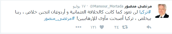 وقال في تغريدة له على موقع التدوين المصغر “تويتر” : ” تركيا لن تعود كما كانت كالخلافة العثمانية، و أردوغان اتجنن خلاص، ربنا بيخلص، تركيا أصبحت مأوى للإرهابيين”.