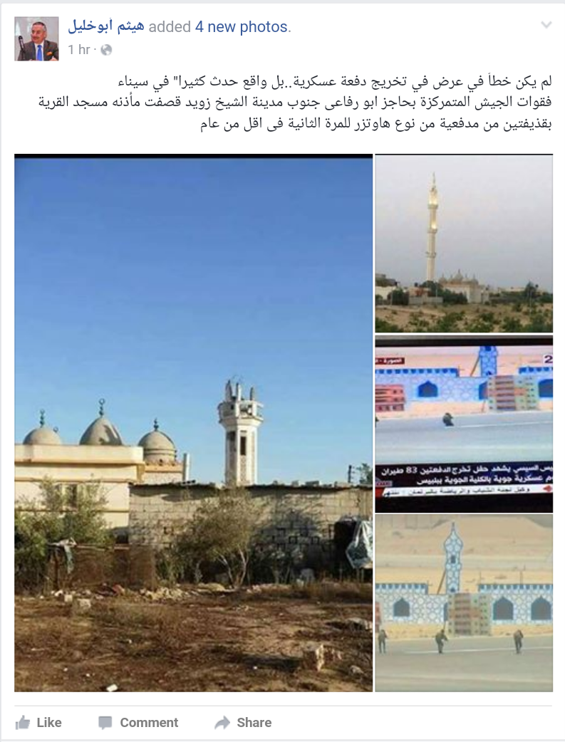 قامت مجموعة من الجيش المصري بالتدريب على اقتحام مسجد على هيئة مجسم وإطلاق الرصاص عليه، حيث اقتحموه ودمروه بالكامل وذلك أثناء تخريج دورة عسكرية بحضور عبدالفتاح السيسي ورئيس الوزراء شريف إسماعيل ووزير الدفاع صدقي صبحي ووزير الداخلية أيضًا.