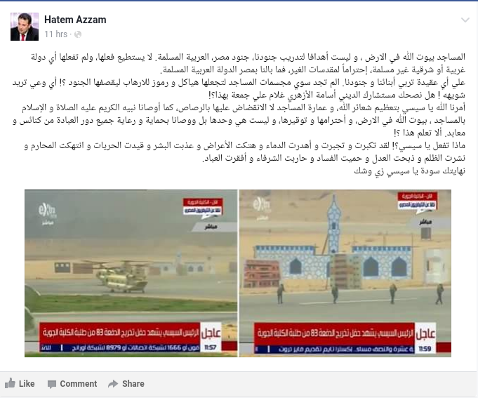 وقال المهندس حاتم عزام – القيادي بحزب الوسط – إن المساجد بيوت الله في الأرض، وليست أهدافا لتدريب جنودنا، جنود مصر، العربية المسلمة.