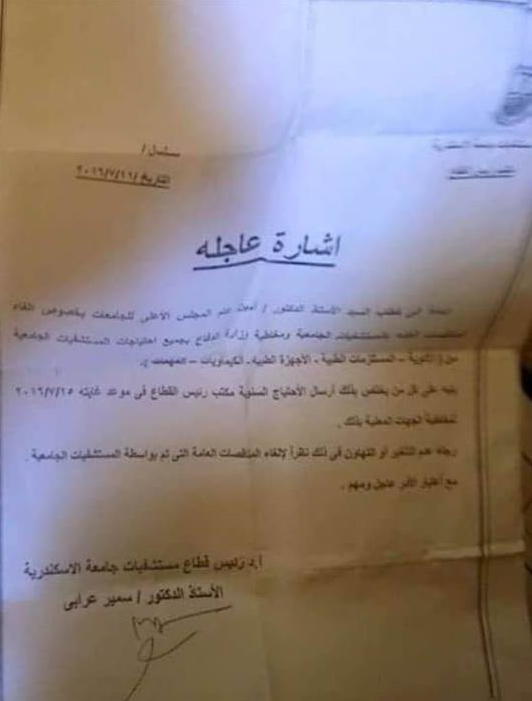 تداول رواد مواقع التواصل الاجتماعي، صورة ضوئية من خطاب صادر عن رئيس قطاع مستشفيات جامعة الإسكندرية، أ.د. سمير عرابي، يحيط المستشفيات علمًا بتعميم صادر عن أمين عام المجلس الأعلى للجامعات متضمنًا موافاة أمانة المجلس الأعلى للجامعات بالاحتياجات التي تتطلبها المستشفيات الجامعية التابعة لكلية الطب جامعة الإسكندرية، من أدوية وتجهيزات ومستلزمات الأجهزة الطبية خلال شهر يوليو؛ ومخاطبة وزارة الدفاع بجميع احتياجات المستشفيات الجامعية”.