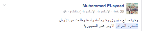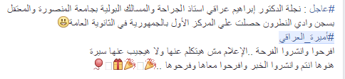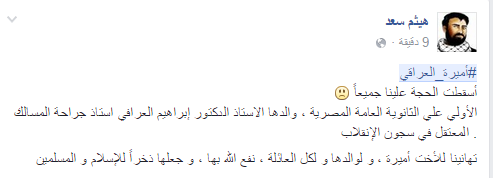 دشن رواد موقع التواصل ” فيس بوك ” هاشتاجا تحت اسم “أميرة العراقي”، وتوالت التبريكات والتهاني مشيدين بتفوقها رغم ظروف اعتقال والدها.
