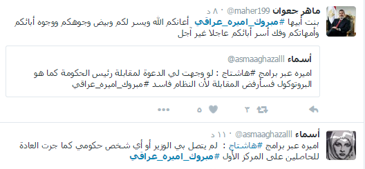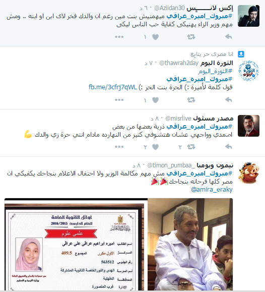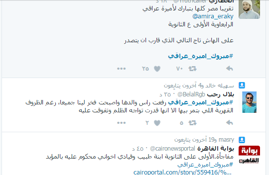 دشن مغردو موقع التدوين المصغر “تويتر” هاشتاج بعنوان”مبروك اميره عراقي” ردا على تجاهل الحكومة ووزير التعليم لتهنئة الطالبة أميرة ابنة العالم والدكتور “إبراهيم عراقى على ” المعتقل والمحكوم علية بالمؤبد في سجون النظام.