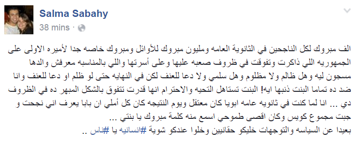 علّقت الإعلامية سلمى صباحي على مهاجمة البعض للطالبة أميرة في تغريدة على حسابه على “تويتر”: “ألف مبروك لكل الناجحين في الثانوية العامة ومليون مبروك للأوائل ومبروك خاصة جدًا لأميرة الأولى على الجمهورية اللي ذاكرت وتفوقت في ظروف صعبة عليها وعلى أسرتها واللي بالمناسبه معرفش والدها مسجون ليه وهل ظالم ولا مظلوم وهل سلمي ولا دعا للعنف”.