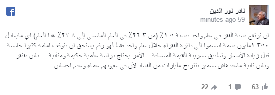 وقال “نور الدين” في منشور له عبر صفحته على موقع التواصل الاجتماعي “فيسبوك”: “ان ترتفع نسبة الفقر في عام واحد بنسبة ١.٥٪ (من ٢٦.٣٪ في العام الماضي إلي ٢٧.٨٪ هذا العام) أي ما يعادل ١.٣٥٠مليون نسمة انضموا الي دائرة الفقراء خلال عام واحد فقط، لهو رقم يستحق أن نتوقف أمامه كثيرًا، خاصة قبل زيادة الأسعار وتطبيق ضريبة القيمة المضافة”.