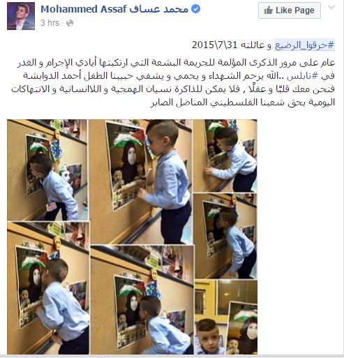 وقال عساف:”عام على مرور الذكرى المؤلمة للجريمة البشعة التي ارتكبتها أيادي الإجرام والغدر فينابلس.. الله يرحم الشهداء ويحمي ويشفي حبيبنا الطفل أحمد الدوابشة فنحن معك قلبًا وعقلًا، فلا يمكن للذاكرة نسيان الهمجية واللإنسانية والانتهاكات اليومية بحق شعبنا الفلسطيني المناضل الصابر”.