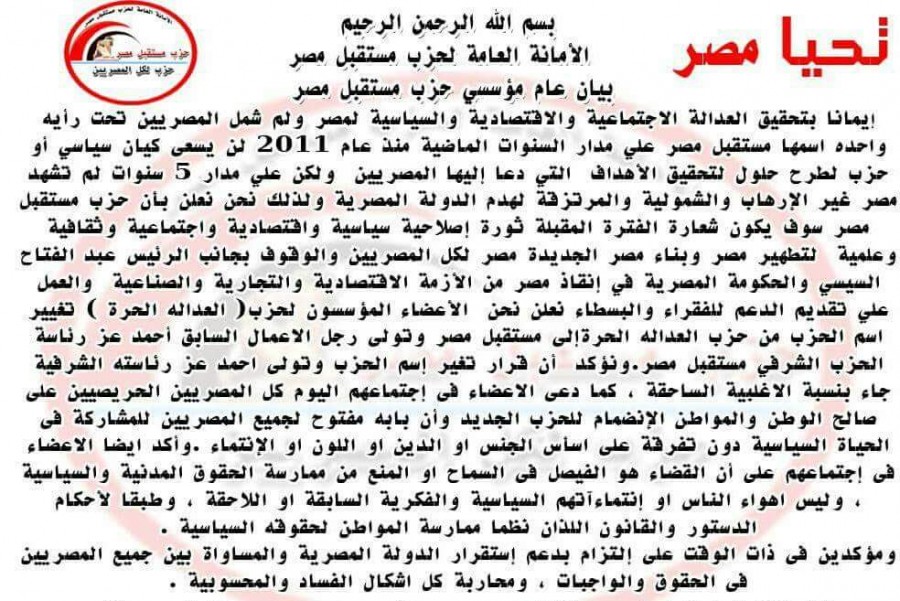 ومن جانبه، أصدرت الأمانة العامة لحزب “مستقبل مصر”، بيانًا، صباح اليوم، أعلن الأعضاء المؤسسون لحزب العداله الحرة فيه تغيير اسم الحزب من حزب العداله الحرة إلى مستقبل مصر وتولى رجل الأعمال السابق أحمد عز رئاسة حزب مستقبل مصر شرفًيا.