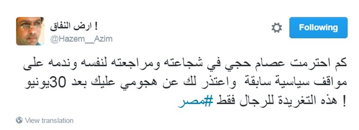 وكتب حازم عبد العظيم تغريدة على تويتر: “كم احترمت عصام حجي في شجاعته ومراجعته لنفسه وندمه على مواقف سياسية سابقة وأعتذر لك عن هجومي عليك بعد 30 يونيو! هذه التغريدة للرجال فقط”.