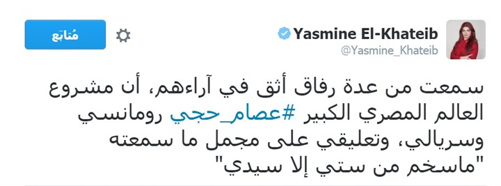 وقالت ياسمين، عبر حسابها الشخصى على موقع التواصل الاجتماعى “تويتر”، مساء أمس الثلاثاء: “سمعت من عدة رفاق أثق في آرائهم، أن مشروع العالم المصري الكبير عصام حجي رومانسي وسريالي، وتعليقي على مجمل ما سمعته ما أسخم من ستي إلا سيدي”.