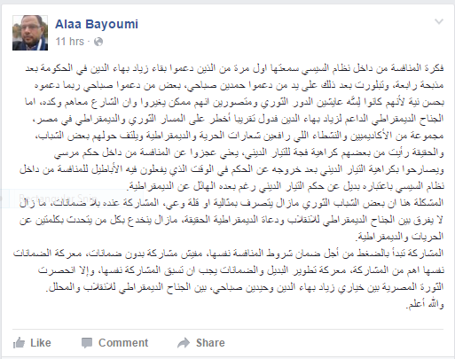 وقال بيومي في منشور له على حسابه بموقع التواصل الاجتماعي “فيسبوك” : ” فكرة المنافسة من داخل نظام السيسي سمعتها أول مرة من الذين دعموا بقاء زياد بهاء الدين في الحكومة بعد مذبحة رابعة، وتبلورت بعد ذلك على يد من دعموا حمدين صباحي، بعض من دعموا صباحي ربما دعموه بحسن نية لأنهم كانوا لِسَّه عايشين الدور الثوري ومتصورين أنهم ممكن يغيروا وان الشارع معاهم وكده، أما الجناح الديمقراطي الداعم لزياد بهاء الدين فدول تقريبًا أخطر على المسار الثوري والديمقراطي في مصر”.