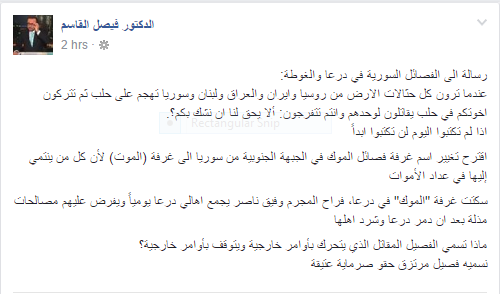 وأضاف القاسم في منشور له على حسابه بموقع التواصل الاجتماعي “فيسبوك”: “اقترح تغيير اسم غرفة فصائل الموك في الجبهة الجنوبية من سوريا إلى غرفة “الموت”، لأن كل من ينتمي إليها في عداد الأموات”.