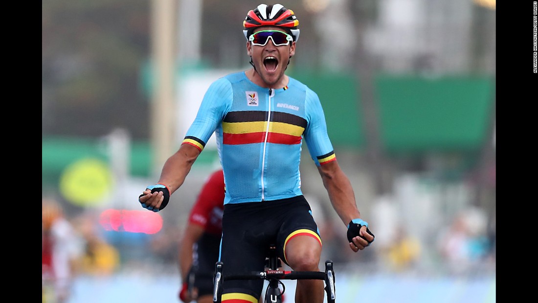 واحتفل جريج فان أفرميت من بلجيكا بالفوز بالميدالية الذهبية، بعد عبور خط النهاية سباق الدراجات للرجال.