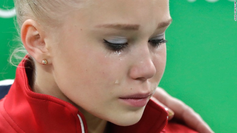 الدموع تتساقط من وجه البطلة الروسية أنجلينا ميلنيكوفا عندما غادرت الملعب بعد فشلها في التأهل لنهائي منافسات الجمباز للسيدات.