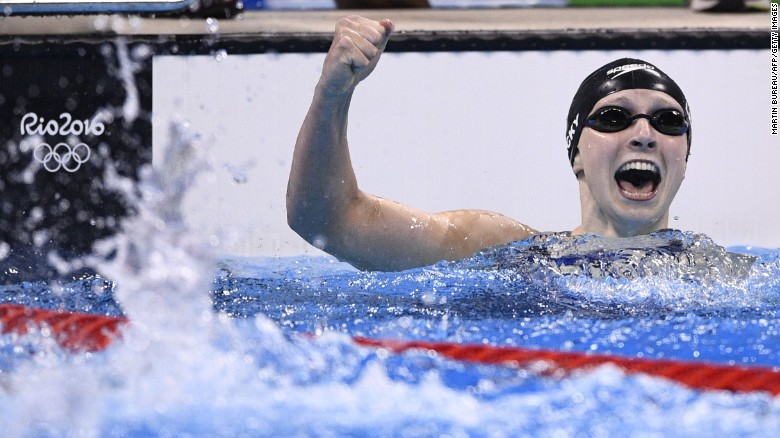 تحتفل كاتي ليديكي من الولايات المتحدة بعد فوزها بالميدالية الذهبية في نهائي سباحة 400M حرة للسيدات.