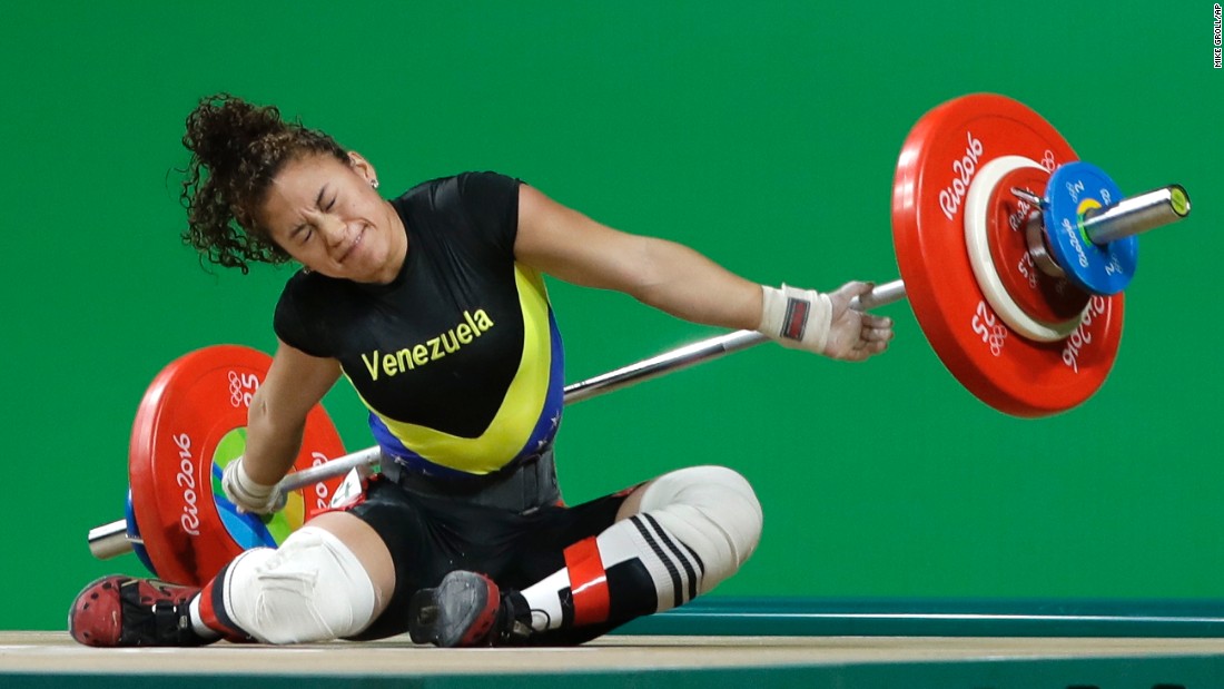 رافعة الأثقال الفنزويلية يوسليدي فيغيروا تقع على الأرض خلال منافستها في حمل الأثقال فئة وزن 58 كيلوغراما.