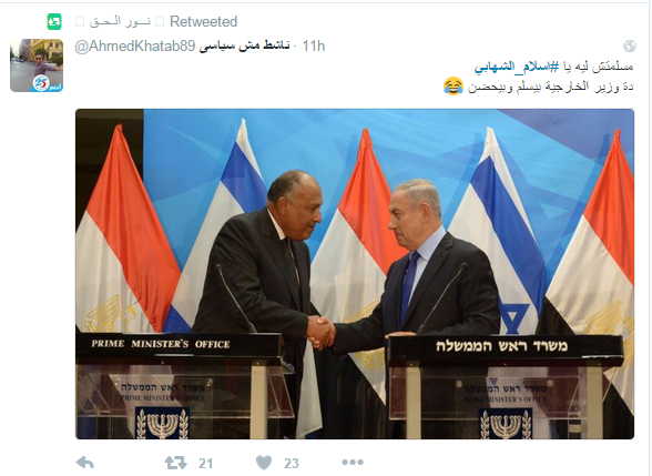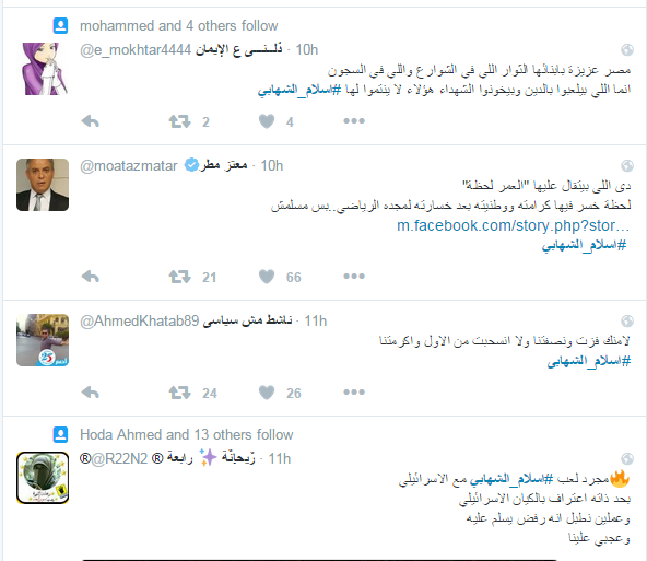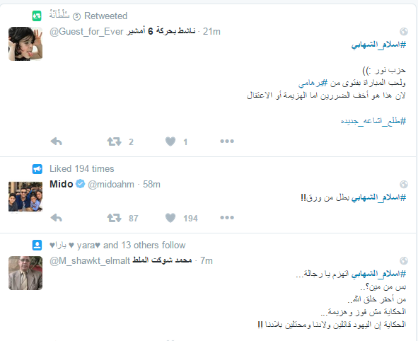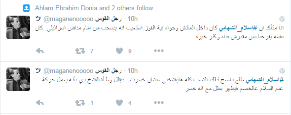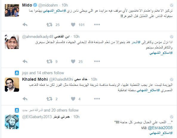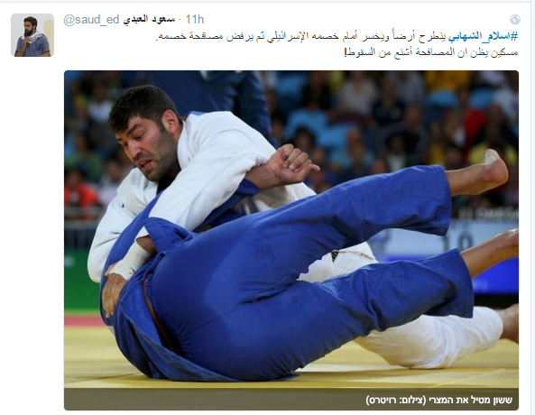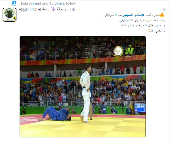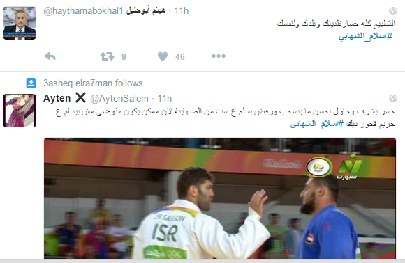 دشن مغردو موقع التدوين المصغر “تويتر”هاشتاج بإسم لاعب الجودو المصري إسلام الشهابي، وذلك عقب إنتهاء مباراته مع اللاعب الإسرائيلي أورى ششون ضمن منافسات الجودو فى أولمبياد ريودى جانيرو وزن 100 كيلو جرام، والذي خسر فيها بسهولة، ثم رفض مصافحة اللاعب الصهيوني.