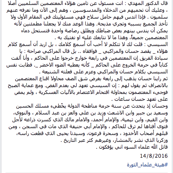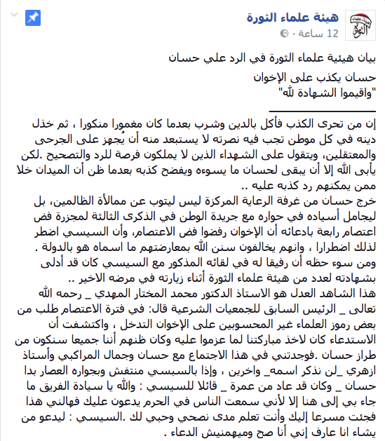 وتابع البيان :”من سوء حظه أن رفيقا له في لقائه المذكور مع السيسي كان قد أدلى بشهادته لعدد من هيئة علماء الثورة أثناء زيارته في مرضه الاخير..هذا الشاهد العدل هو الاستاذ الدكتور محمد المختار المهدي _ رحمه الله تعالى _ الرئيس السابق للجمعيات الشرعية والذي قال: في فترة الاعتصام طلب من بعض رموز العلماء غير المحسوبين على الإخوان التدخل ، واكتشفت أن الاستدعاء كان لاخذ مباركتنا لما عزموا عليه وكان ظنهم أننا جميعا سنكون من طراز حسان ، فوجدتني في هذا الاجتماع مع حسان وجمال المراكبي وأستاذ ازهري _لن نذكر اسمه_ واخرين”.