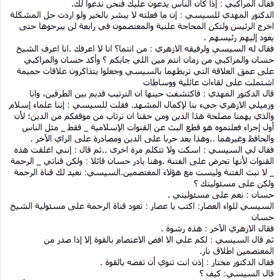 ورد عليه السيسي : “قلت لك لا تتكلم لا أحب أن أسمع كلامك ، بل اريد أن أسمع كلام هؤلاء _ يقصد حسان والمراكبي _ فوافقاه”.