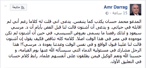 وأضاف في منشور له عبر صفحته الشخصية بموقع التواصل الاجتماعي “فيس بوك” ، يدعى أن آشتون قالت لنا قبل الفض بأيام أن د. مرسي سيعود و لذلك رفضنا ما يسمى بعروض السيسي، في حين أن آشتون لم تكن موجوده في مصر في هذا الوقت اصلا.. كلامه كله تناقض فكيف يقول إن آشتون قالت لنا علينا قبول الواقع و في نفس الوقت وعدتنا بعودة د. مرسي؟! هذا الرجل مشارك في مسئولية الدماء التي سيسأله الله عنها يوم القيامه”.
