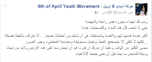 وبرغم تأييد الحركة لفض الاعتصام بدعوي أنه مسلح ،فقد قامت أمس بنشر منشور علي صفحتها الرسمية ، وصفه البعض بـ”الاعتذار “، حيث جاء فيه : “رحم الله شهداء مجزرة فض رابعة والنهضة حتى لاتذهب كل هذه الدماء والتضحيات هباء”.