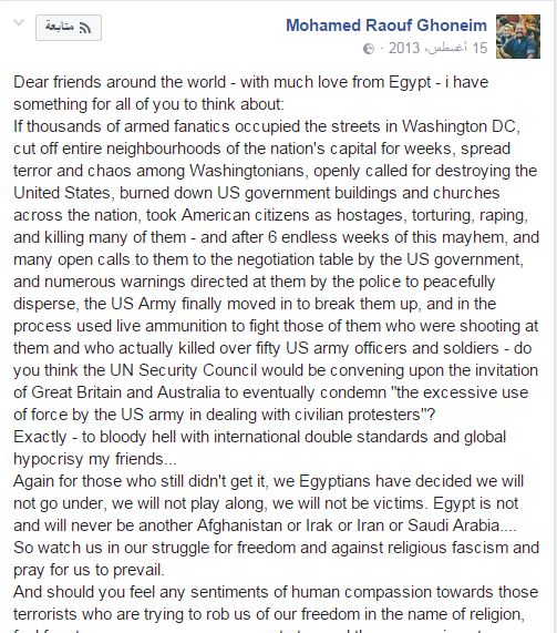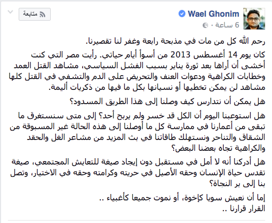 منشور ” غنيم ” بعد الفض بيوم واحد ، والذي تم تداوله علي نطاق واسع ونشره موقع ” BBC ” :