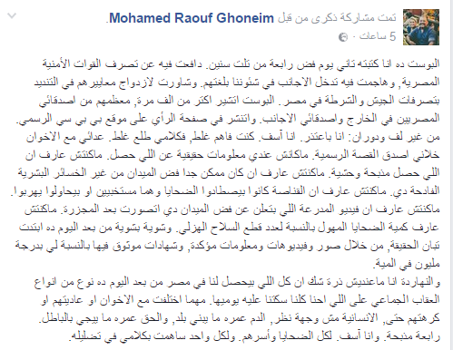 وقال :” انا آسف.. كنت فاهم غلط ، فكلامي طلع غلط.. عدائي مع الاخوان خلاني اصدق القصة الرسمية.. ماكانش عندي معلومات حقيقية عن اللي حصل.. ماكنتش عارف ان اللي حصل مذبحة وحشية ، ماكنتش عارف ان القناصة كانوا بيصطادوا الضحايا وهما مستخبيين او بيحاولوا يهربوا.. ماكنتش عارف ان فيديو المدرعة اللي بتعلن عن فض الميدان دي اتصورت بعد المجزرة ، وشوية بشوية من بعد اليوم ده ابتدت تبان الحقيقة, من خلال صور وفيديوهات ومعلومات مؤكدة, وشهادات موثوق فيها بالنسبة لي بدرجة مليون في المية ”