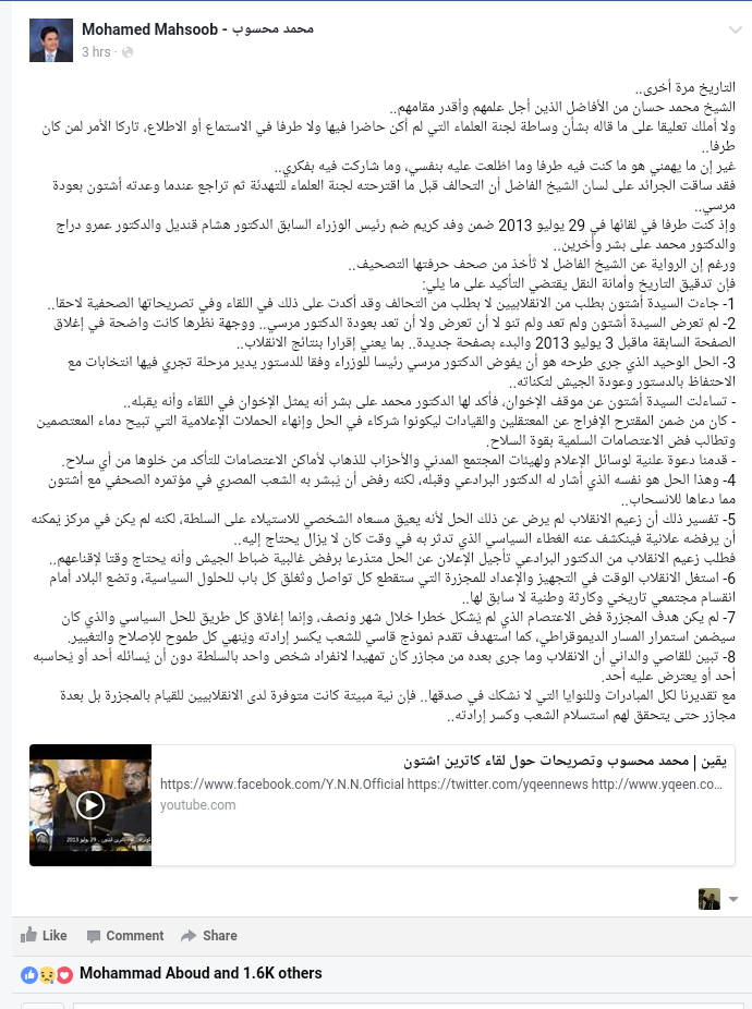 ويضيف محسوب عبر “فيس بوك” : كنت طرفا في لقاء اشتون يوم 29 يوليو 2013 ضمن وفد كريم ضم رئيس الوزراء السابق الدكتور هشام قنديل والدكتور عمرو دراج والدكتور محمد على بشر وآخرين، وبالرغم إن الرواية عن الشيخ الفاضل لا تُأخذ من صحف حرفتها التصحيف.. فإن تدقيق التاريخ وأمانة النقل يقتضي التأكيد على أن السيدة أشتون جاءت بطلب من الانقلابيين لا بطلب من التحالف وقد أكدت على ذلك في اللقاء وفي تصريحاتها الصحفية لاحقا.