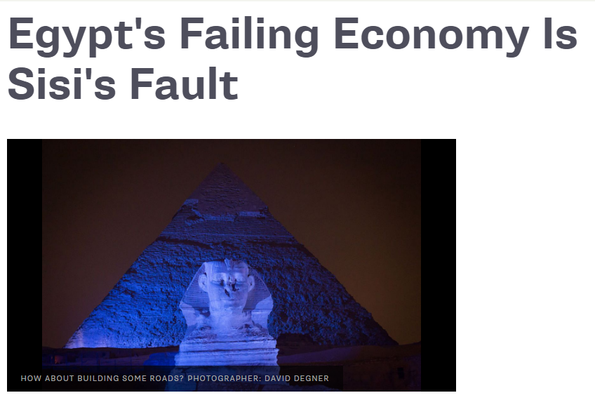 وخصصت وكالة “بلومبرج” الاقتصادية الأميركية،أمس الثلاثاء، افتتاحيتها لتسليط الضوء على الشأن المصري، متهمة عبد الفتاح السيسي بأنه السبب وراء تردي الوضع الاقتصادي المصري.