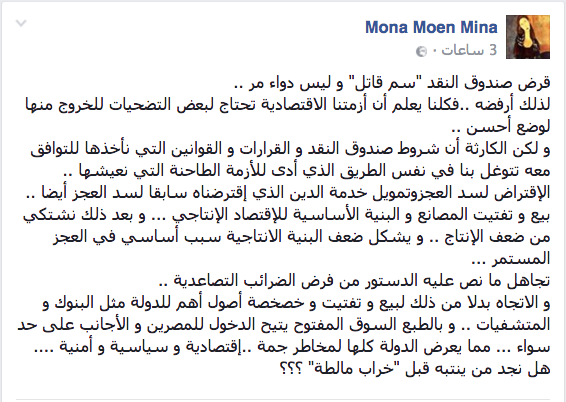 قالت “مينا”، عبر صفحتها على موقع التواصل الاجتماعي “فيسبوك”: “كلنا يعلم أن أزمتنا الاقتصادية تحتاج لبعض التضحيات للخروج منها لوضع أحسن، ولكن الكارثة أن شروط صندوق النقد والقرارات والقوانين التي تصدر للتوافق معه، تتوغل بنا في نفس الطريق الذي أدى للأزمة الطاحنة التي نعيشها”.