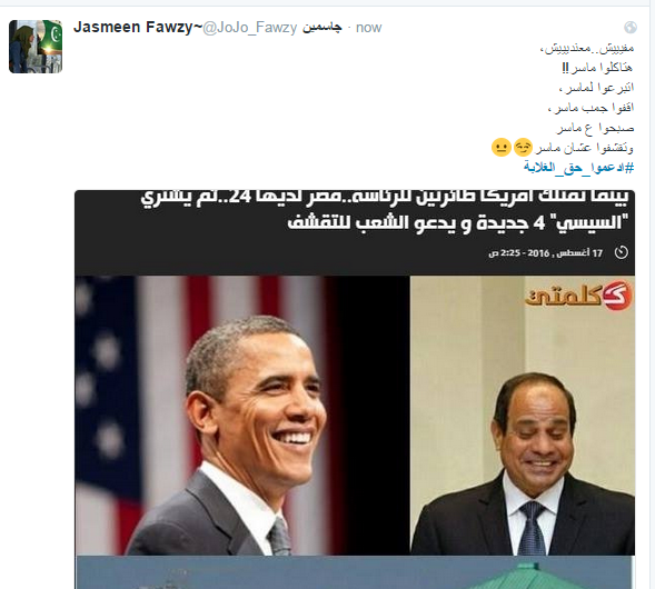 دشن مغردو موقع التدوين العالمي”تويتر” هاشتاج “ادعموا حق الغلابة” ضد رسائل السيسي العشرة التي دعا خلالها الى الترشيد والتقشف، في ظل زيادة معدل البطالة والفقر، بالاضافة الى ارتفاع معدل التضخم وانخفاض قيمة الجنيه المصري مقابل الدولار الأمريكي والذي اقترب من الوصول إلى 13 جنيه.