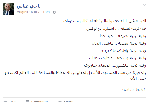 كتب” عباس ” على صفحته عبر فيسبوك: التربية في البلد دي والعالم كله أشكال ومستويات فيه تربية نضيفة وفيه تربية …. ، مجاري بلاعات وفيه تربية ماهينور انحطاط خنازيري …. “