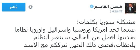أكد فيصل القاسم الإعلامي السوري والمذيع بقناة الجزيرة الفضائية القطرية، أنّ بشار الأسد يقصف في سوريا بمباركة وبتعليمات مباشرة من الولايات المتحدة الأميركية.