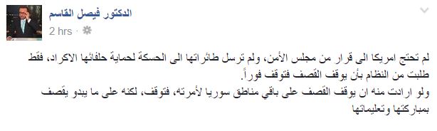 وقال القاسم في منشور له عبر حسابه الرسمي على موقع “فيس بوك”: “لم تحتج امريكا إلى قرار من مجلس الأمن، ولم ترسل طائراتها الى الحسكة لحماية حلفائها الاكراد، فقط طلبت من النظام بأن يوقف القصف فتوقف فورًا”.