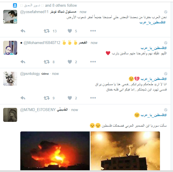 تصدر هاشتاج “فلسطين يا عرب” قائمة الأعلى تداولاً على موقع التدوين العالمي “تويتر”، تضامنًا مع غزة بعد تعرضها لعمليات قصف كبيرة منذ أمس من قبل مقاتلات الاحتلال الإسرائيلي.