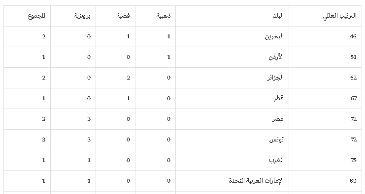 ونجحت 8 دول عربية في الحصول على مراكز في ريو دي جانيرو، هم البحرين، والامارات، والجزائر، وقطر، ومصر، والمغرب، الاردن، وحلت البحرين في المركز الأول عربيا والـ46 عالميا في جدول ميداليات أولمبياد ريو 2016 ،