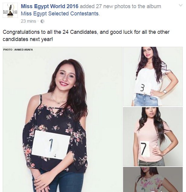 نشرت صفحة “ملكة جمال مصر 2016” على موقع التواصل الاجتماعي “فيس بوك” صور مرشحات مصريات تم اختيارهن للاشتراك في المسابقة.