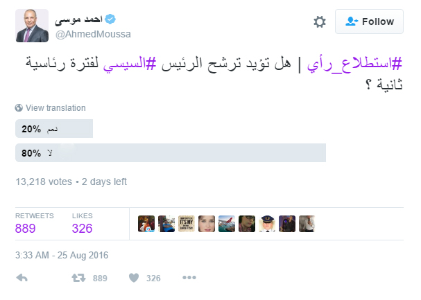 أجرى أحمد موسى المذيع بقناة صدى البلد، استطلاعًا للرأي على حسابه الرسمي عبر موقع التواصل الإجتماعي “تويتر” لسؤال الجمهور عن تأييدهم لترشح عبدالفتاح السيسي لفترة رئاسية ثانية.