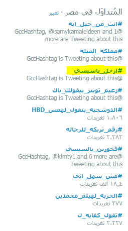 وجاء ذلك عبر هاشتاج دشنوه منذ قليل حمل اسم ” ارحل ياسيسي “، وتصدر قائمة الهاشتاجات الأكثر تداولاً على موقع “تويتر ” محتلاً المركز الثالث بها.