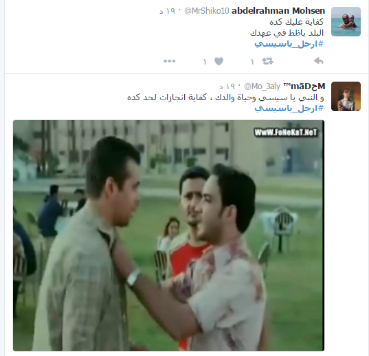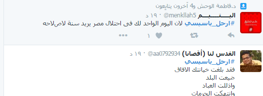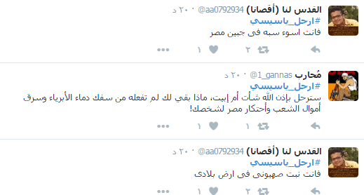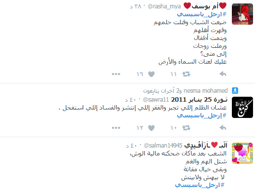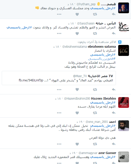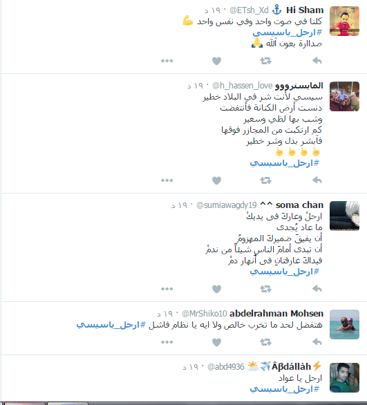 وأجمع النشطاء خلال الهاشتاج بضرورة رحيل السيسي معددين الأسباب منها “تفشي الظلم والفساد- قهر الشباب والزج بهم في السجون – التعاون من الكهيان الصهيوني – انهيار الوضع الاقتصادي “.