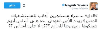 وقال عبر “تويتر” : ” قال إيه، شراء مستثمرين أجانب للمستشفيات المصرية يهدد الأمن القومي.. ده على أساس أنهم هيفكوها ويهربوها للخارج؟؟ و لا على أساس؟؟”.