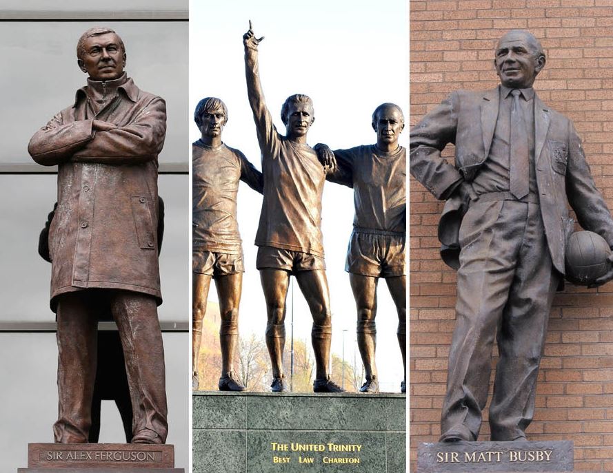 2- السير اليكس فيرغسون، وثلاثي يونايتد والسير مات بوسبي في ملعب اولد ترافورد، ومانشستر يونايت.