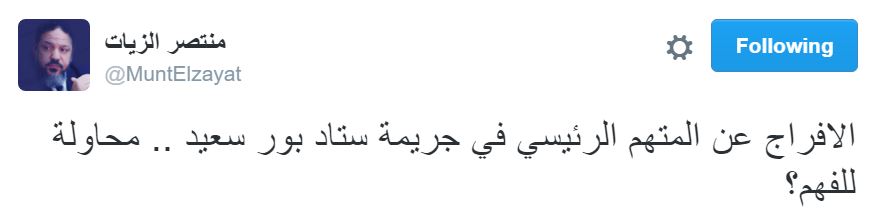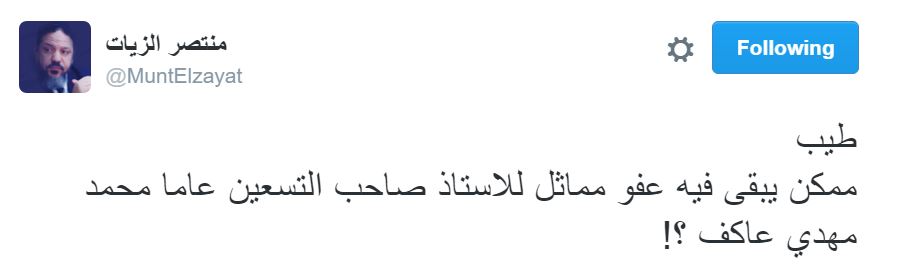 وقال الزيات في تغريدة عبر حسابه الشخصي بموقع التدوين المصغر “تويتر”: “الإفراج عن المتهم الرئيسي في جريمة ستاد بور سعيد.. محاولة للفهم؟ طيب.. ممكن يبقى فيه عفو مماثل للأستاذ صاحب التسعين عامًا محمد مهدي عاكف؟!”.