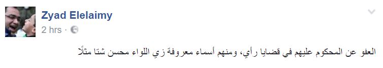 وسخر البرلماني السابق زياد العليمي، من القرار ، وقال في تدوينة عبر صفحته الشخصية بموقع التواصل الاجتماعي “فيس بوك”: “العفو عن المحكوم عليهم في قضايا رأي، ومنهم أسماء معروفة زي اللواء محسن شتا مثلًا”.