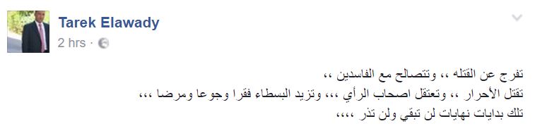 أما المحامي طارق العوضي، فكتب في تدوينة له عبر صفحته الشخصية بموقع التواصل الاجتماعي “فيس بوك”: “تفرج عن القتلة وتتصالح مع الفاسدين.. تقتل الأحرار وتعتقل أصحاب الرأي.. وتزيد البسطاء فقرًا وجوعًا ومرضًا، تلك بدايات نهايات لن تبقي ولن تذر”.