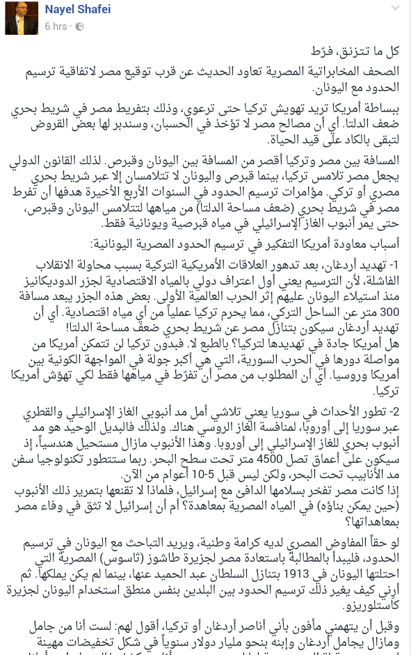 قال الدكتور نائل شافعي – مدير موسوعة المعرفة والمحاضر في معهد ماساتشوستس للتقنية – أن الحديث عن ترسيم الحدود مع اليونان عاد من جديد، حيث عاودت الصحف المخابراتية المصرية الحديث عن قرب توقيع مصر لاتفاقية ترسيم الحدود مع اليونان.