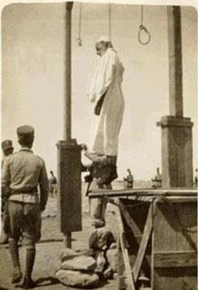 وأحضر الشيخ عمر المختار مكبل الأيدي، وعلى وجهه ابتسامة الرضا بالقضاء والقدر، وبدأت الطائرات تحلق في الفضاء فوق المعتقلين بأزيز مجلجل حتى لا يتمكن عمر المختار من مخاطبتهم، في تمام الساعة التاسعة صباحًا سلم الشيخ إلى الجلاد، وكان وجهه يتهلل استبشارًا بالشهادة وكله ثبات وهدوء، فوضع حبل المشنقة في عنقه، وقيل عن بعض الناس الذين كان على مقربة منه أنه كان يأذن في صوت خافت آذان الصلاة، والبعض قال: إنه تتمتم بالآية الكريمة: (يا أيتها النفس المطمئنة ارجعي إلى ربك راضية مرضية) ليجعلها مسك ختام حياته البطولية.