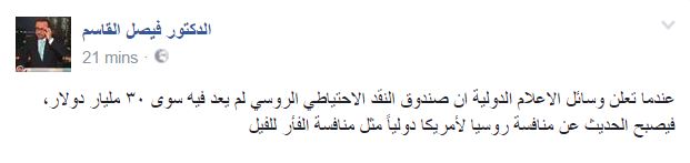 وقال القاسم في منشور له عبر حسابة الرسمي على موقع “فيس بوك”: “عندما تعلن وسائل الاعلام الدولية أن صندوق النقد الاحتياطي الروسي لم يعد فيه سوى ٣٠ مليار دولار، فيصبح الحديث عن منافسة روسيا لأميركا دوليًا مثل منافسة الفأر للفيل”.