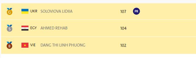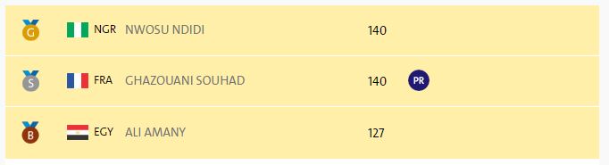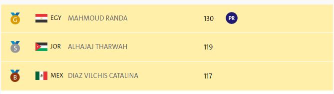 وفازت الرباعة المصرية رحاب أحمد بالميدالية الفضية، في منافسات رفع الأثقال وزن 50 كجم نساء، وجاءت رحاب بالمركز الثاني بعد رفعها لوزن قدره 104 كجم.