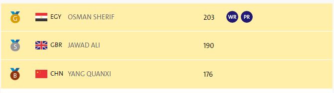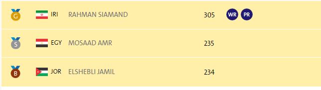 فضية الرباع المصري عمر محمد فاروق، حصل عليها، في أول مشاركة له، في منافسات رفع الأثقال لوزن 107 رجال.