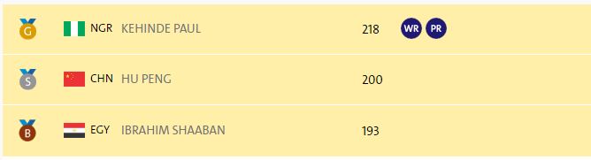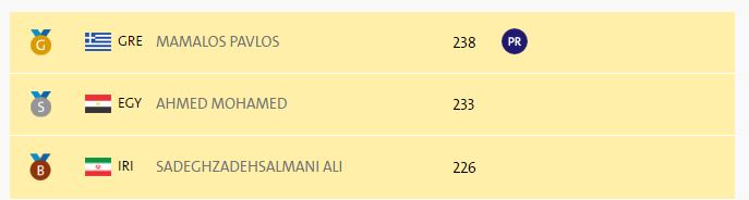 وجاء الرباع المصري محمد أحمد، البالغ من العمر 34 عامًا، في المركز الثاني بعد رفعه لوزن 233 كجم في منافسات رفع الأثقال، ليحوز على الميداية الفضية.